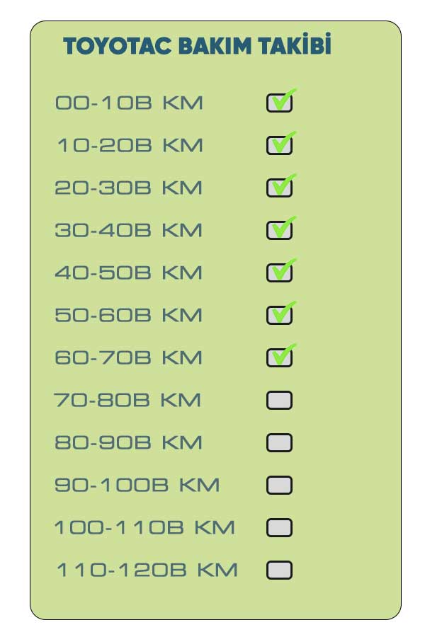 Ardından her 10 bin kilometrelik periyotlarla düzenli bakımlar devam eder. Bu periyotlarda tekrar yağ değişimi, fren sistemleri kontrolü, şanzıman kontrolü gibi işlemler gerçekleştirilir. Motorun ve diğer sistemlerin genel durumu detaylı bir şekilde incelenir.